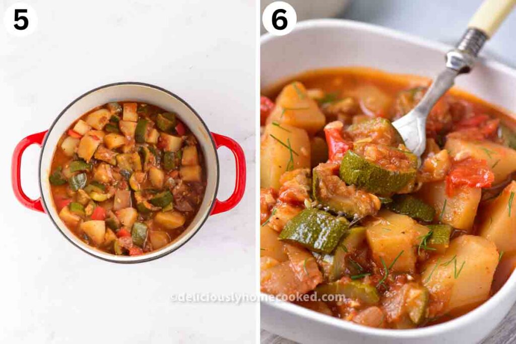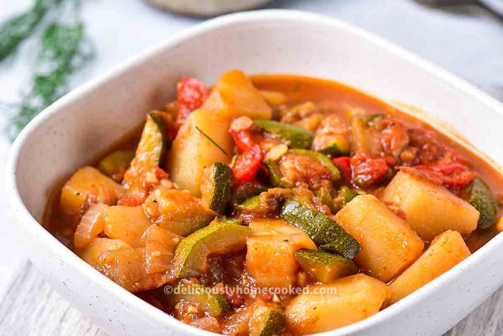 Vegetable stew is thick and hearty, with potatoes, zucchini, and other vegetables simmered until tender in a tomato-based sauce.
