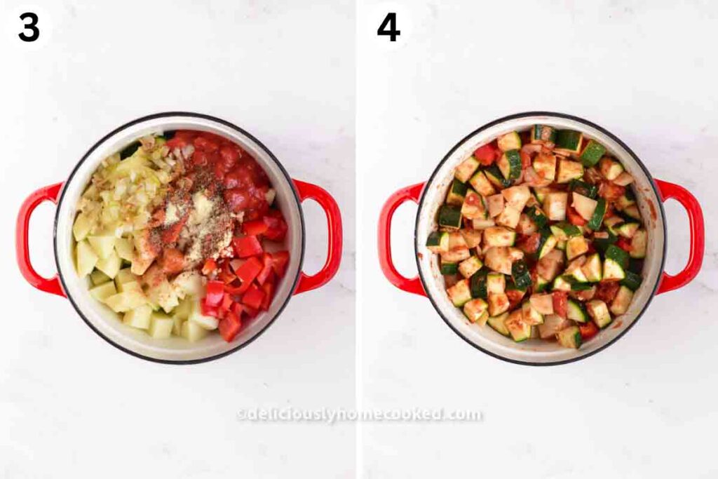 This recipe is filled with hearty potatoes, tender zucchini, bell peppers, and onions simmered in a tomato base.