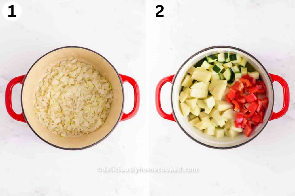 - Heat the oil in a Dutch oven over medium heat. Add onion, garlic, and Sauté for 2 minutes until softened.